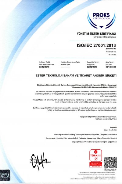 - Ester Teknoloji, Bilgi Güvenliği Yönetim Sistemi tüm faaliyetlerinin güvenlik ve güvenilirlik esasları doğrultusunda, ISO/IEC 27001:2013 ile uyumlu yürütülmesini garanti altına alır.
